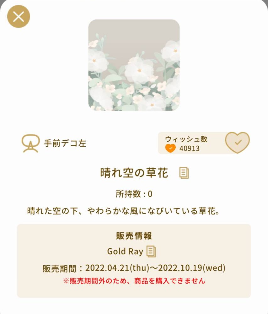 さらに、こちらのN(ノーマル)アイテムは、2022年4月21日~2022年10月19日に販売された【Gold Ray】というガチャの『晴れ空の草花』です。